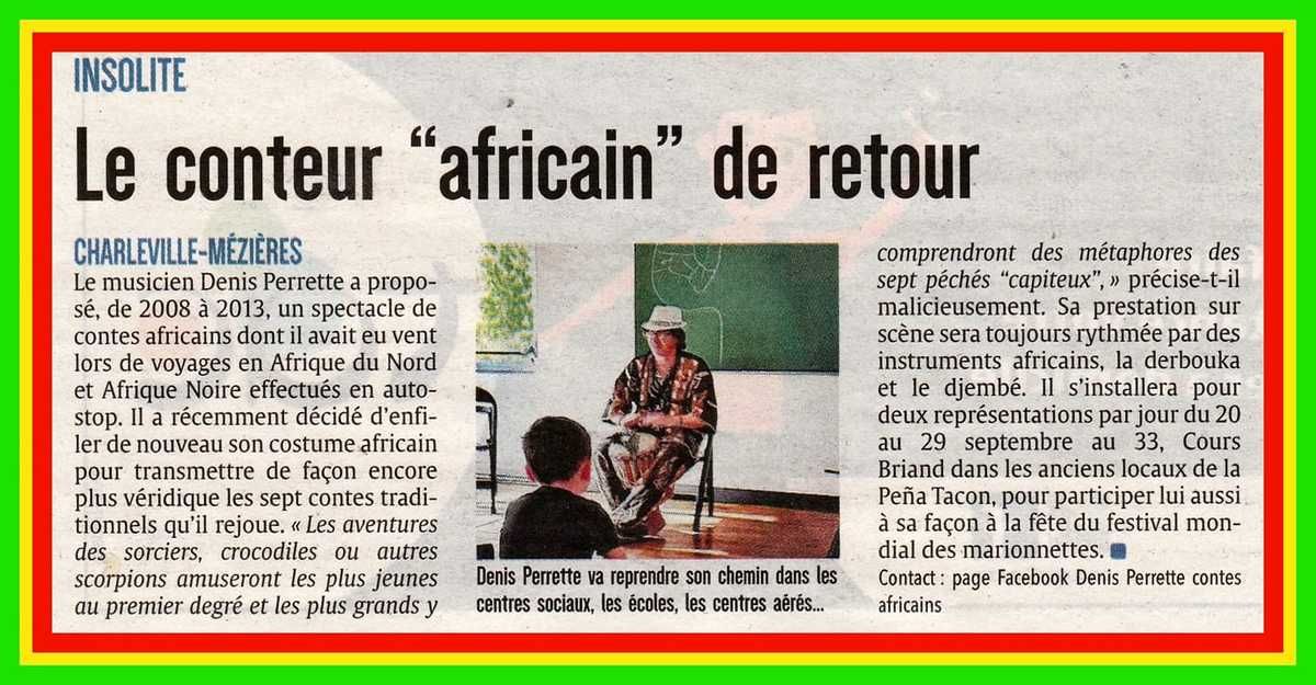 Pendant les dix jours de cette 20ème édition du festival Mondial des Théâtres de Marionnettes, la Cie Plume en Scène est ravie d'accueillir Denis Perrette, musicien et conteur, autour de spectacles de contes africains !