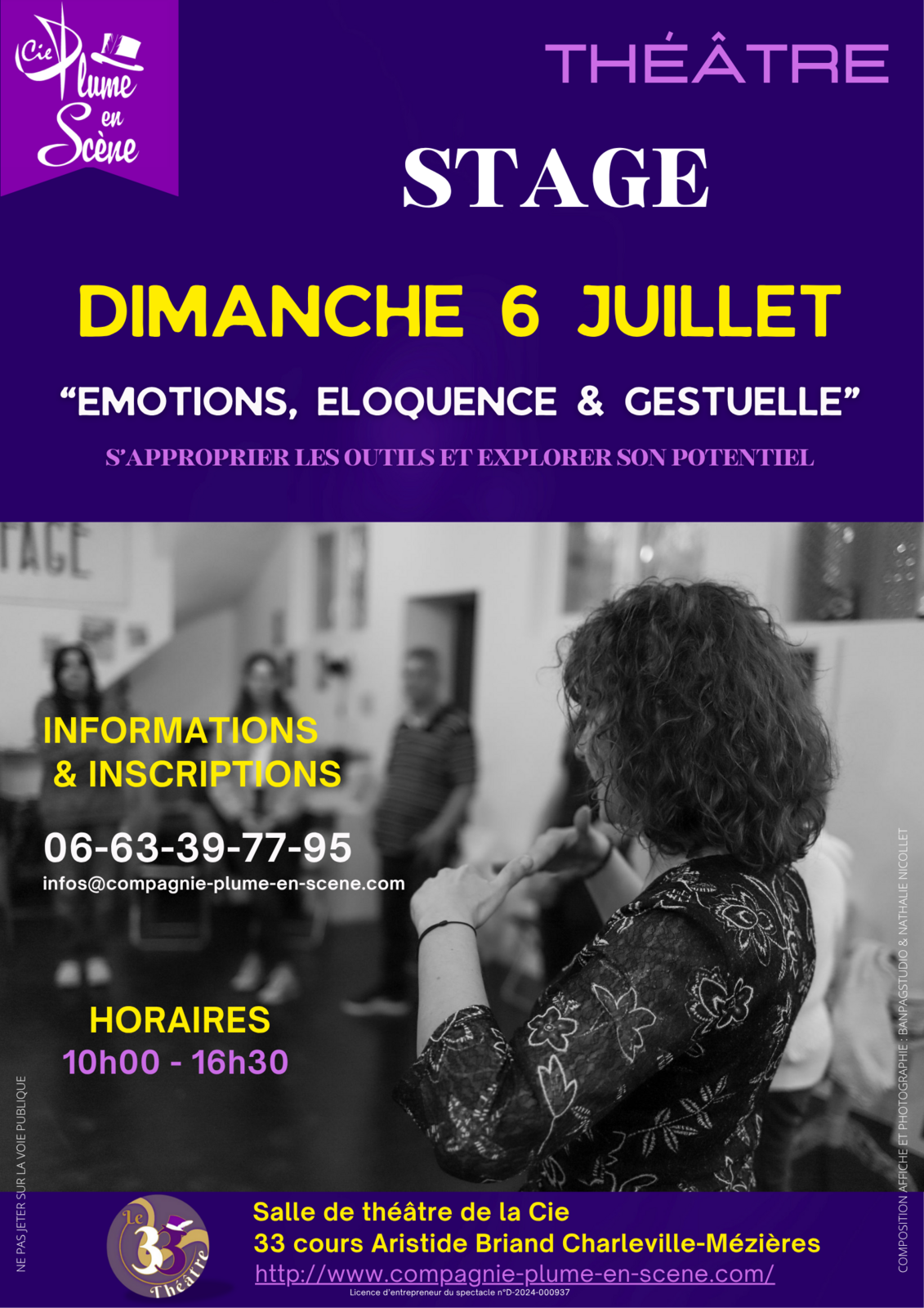 Ouverture des inscriptions au stage de l’ Ecole de Théâtre Cie Plume en Scène intitulé : « GESTION DES EMOTIONS – ELOQUENCE & GESTUELLE » !