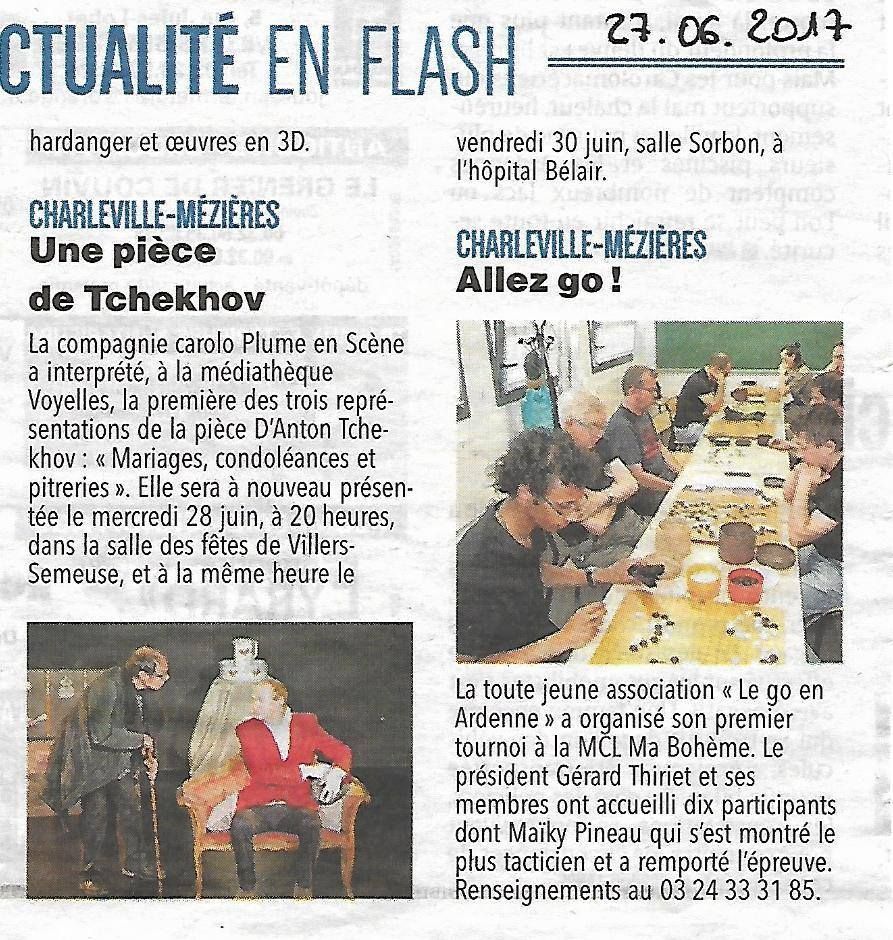 Presse« Mariages, condoléances et pitreries » Création de Nathalie Nicollet14/07/2017 Une création de Nathalie Nicollet, metteur en scène et professeur de théâtre, d’après l’œuvre d’Anton Tchekhov.On y retrouve « La mouette », « La demande en mariage » et « L’ours ».